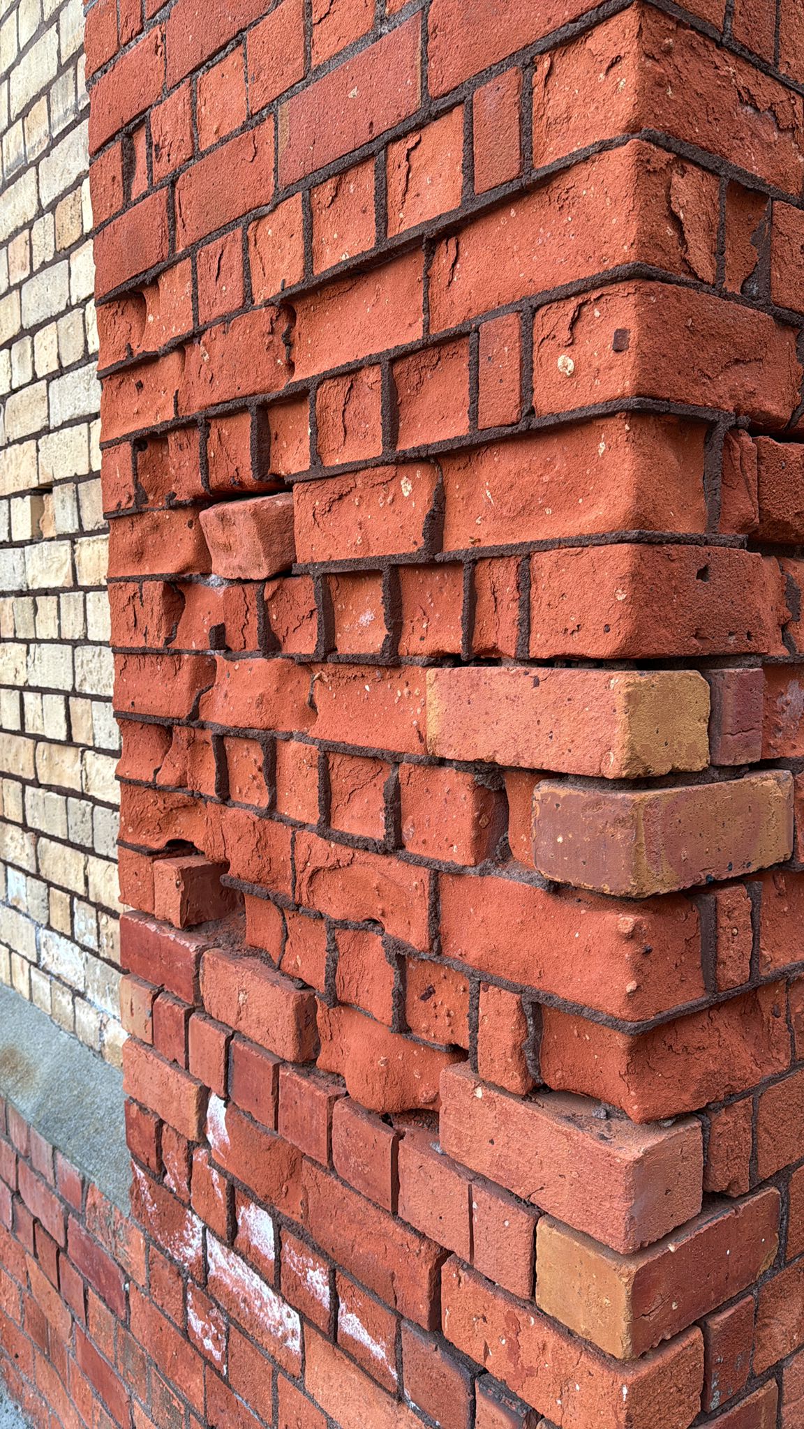 - Spalled bricks from moisture + salts / freeze-thaw-style breakdown in exposed locations