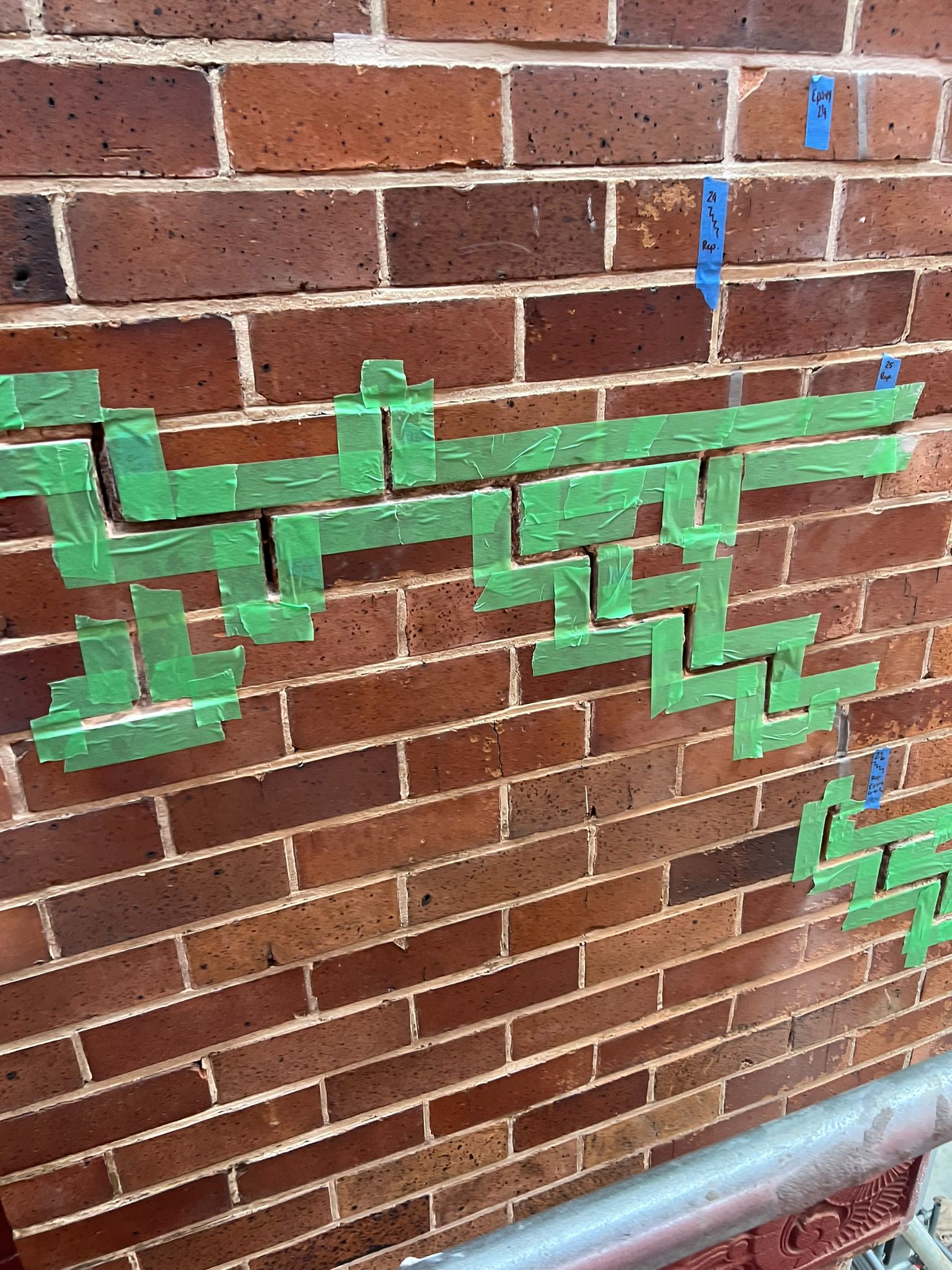 - Installation of stitching bars in mortar joints across cracked zones (commonly stepped cracks in brickwork)